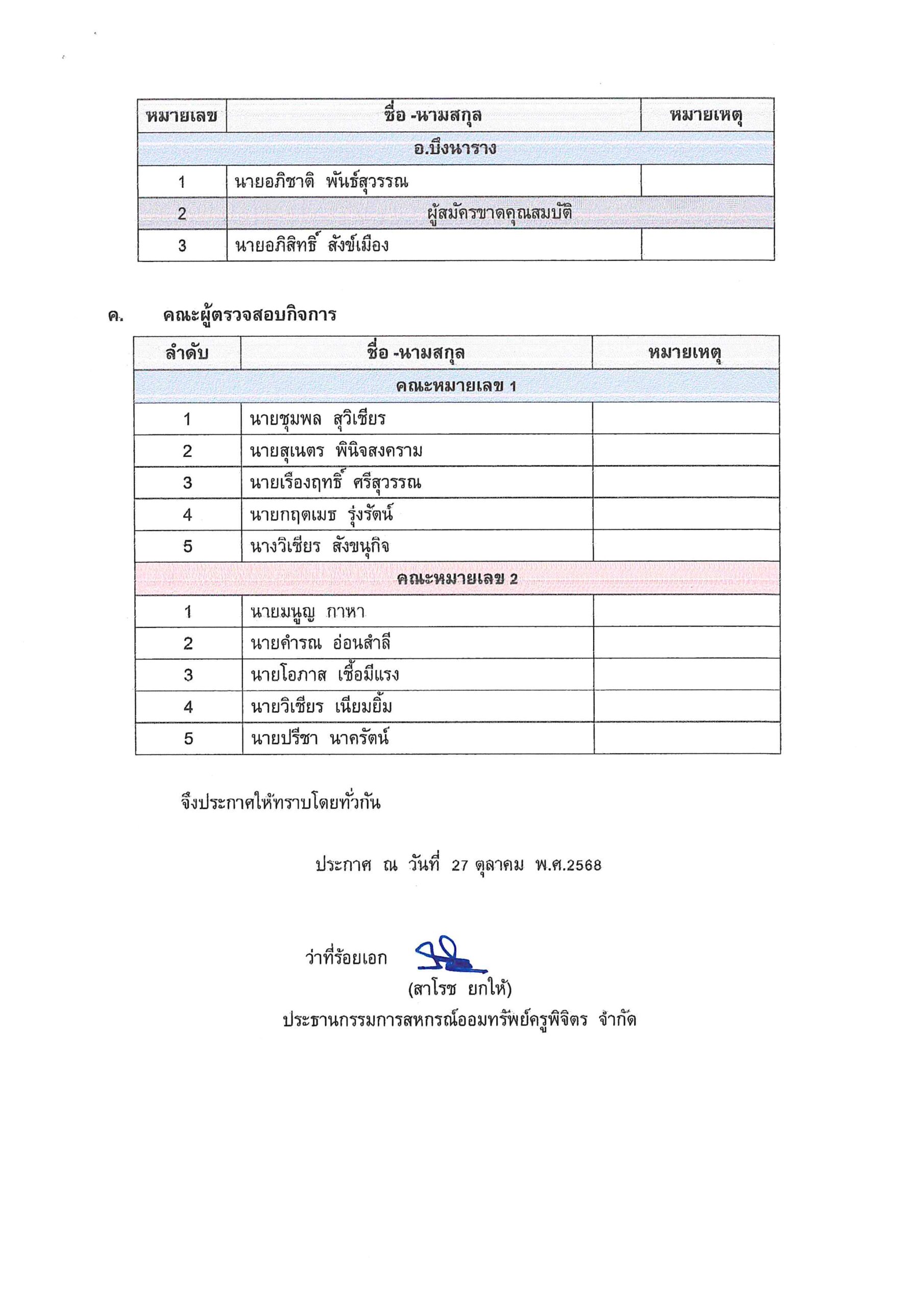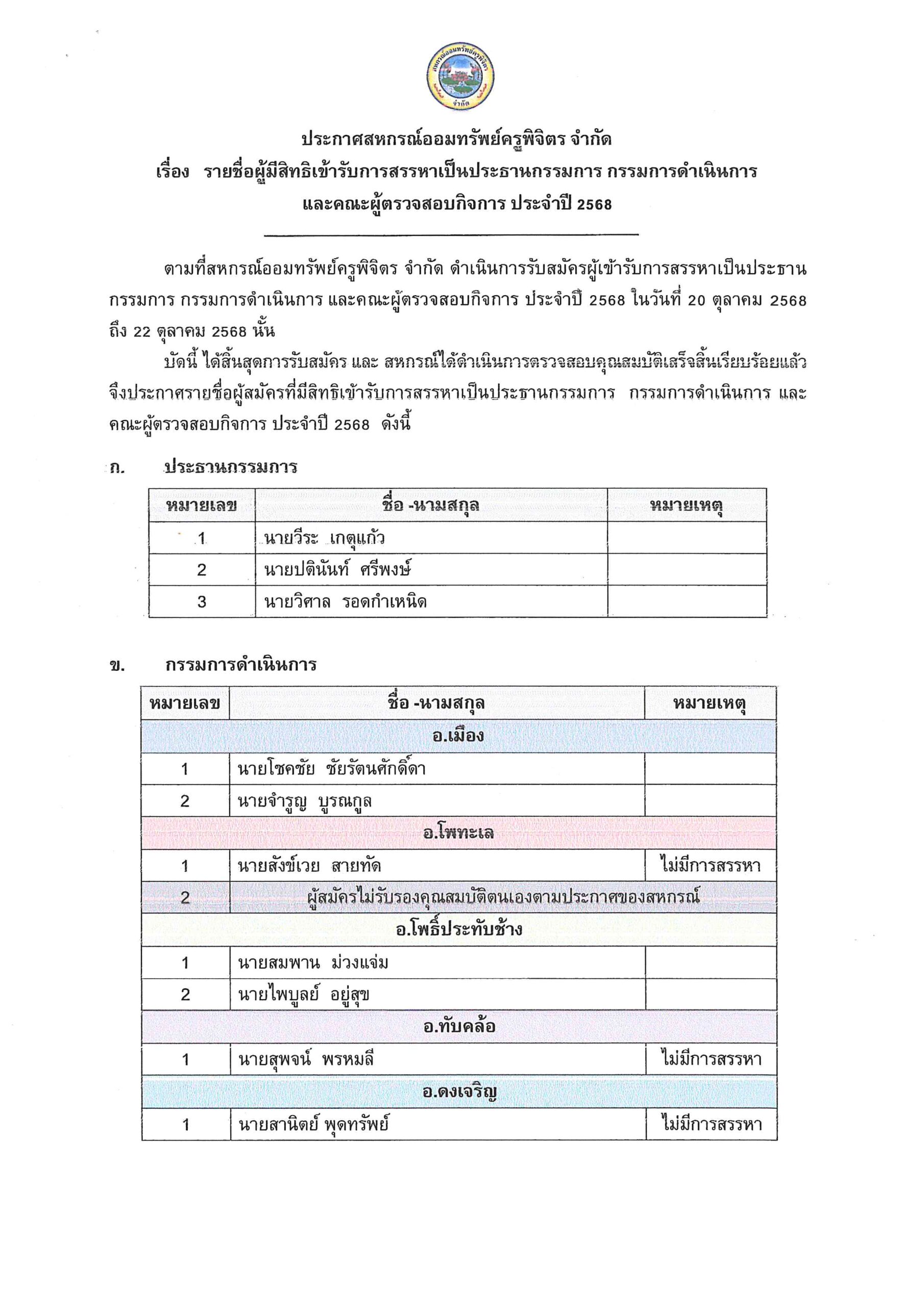 ประกาศ รายชื่อผู้มีสิทธิเข้ารับการสรรหาเป็นประธานกรรมการ กรรมการดำเนินการ และคณะผู้ตรวจสอบกิจการ ประจำปี 2568